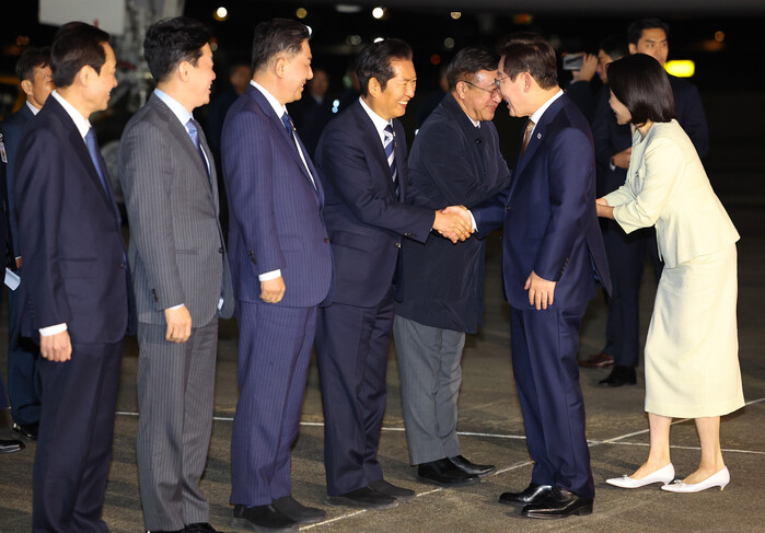 이날 서울공항에는 정청래 더불어민주당 대표, 김병기 원내대표, 강훈식 대통령비서실장, 우상호 정무수석, 윤호중 행정안전부 장관 등이 나와 이 대통령 내외를 직접 맞이했다. 전용기에서 내린 이 대통령은 도열한 인사들의 박수를 받으며 미소로 화답했고, 김혜경 여사는 강 비서실장과 담소를 나누는 장면이 포착됐다.