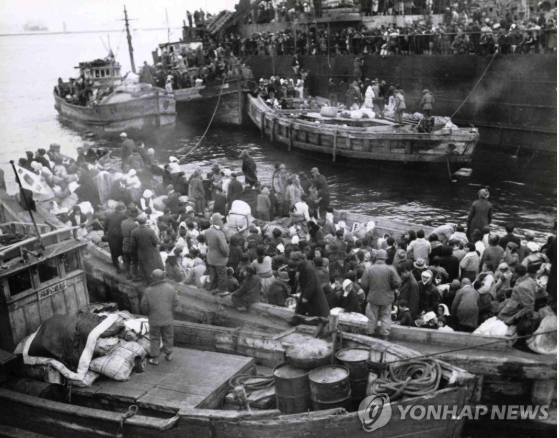 | ▲ 6.25 전쟁이 남긴 초상. 흥남, 밧줄 사다리에 매달려 수송선을 기어오르는 피난민들 1950.12.19 (제공=연합뉴스) |