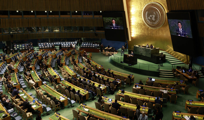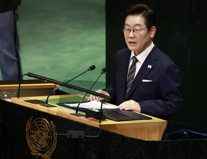 | ▲ 이재명 대통령이 23일(현지시간) 미국 뉴욕 유엔본부 총회장에서 기조연설을 하고 있다. 2025.9.24 (사진=연합뉴스) |