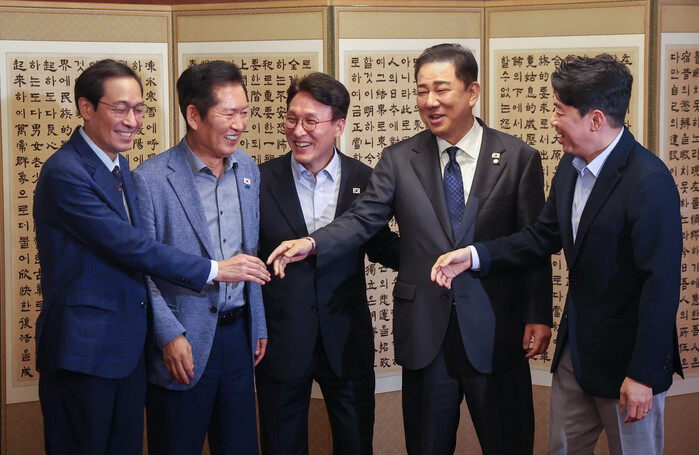 | ▲ 왼쪽부터 우상호 대통령실 정무수석, 더불어민주당 정청래 대표, 김 총리, 더불어민주당 김병기 원내대표, 강훈식 대통령비서실장. 2025.9.14 (사진=연합뉴스) |
