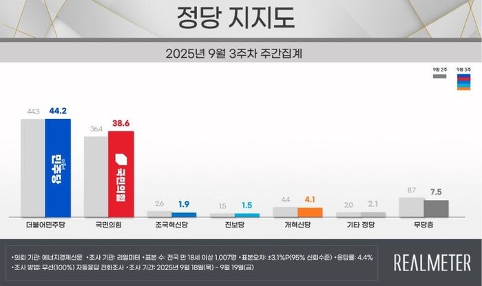 정당 지지도는 민주당이 44.2%, 국민의힘이 38.6%로 나타났다. 민주당은 0.1%포인트 소폭 하락했고, 국민의힘은 2.2%포인트 상승했다. 양당 지지율 격차는 지난주 8.4%포인트에서 5.6%포인트로 줄며 5주 만에 오차범위(±3.1%p) 안으로 진입했다.