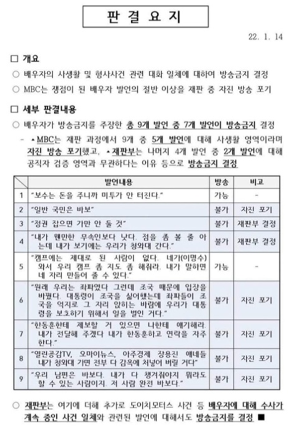 9개 관련 내용중 MBC가 차마 방송에 내기 어려워 자진포기한 내용이 무려 5개고 법원은 2개를 방송 불가 판정을 내리고 2개는 허용했다. 결론은 매체가 마음만 먹으면 자진포기한 5개의 내용도 방송 가능하다는 사실이다.