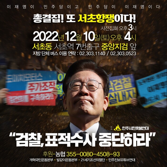 민주시민촛불연대에서는 12월3일에 이어서 12월10일에도 서초동 7번출구에서 또다시 서초항쟁!! “우리가 이재명이다 검찰표적수사 중단하라” 집회를 하였다, 집회는 3시부터 사전행사를 시작하였고, 12월17일은 “전국집중집회” 로 진행한다고 한다.