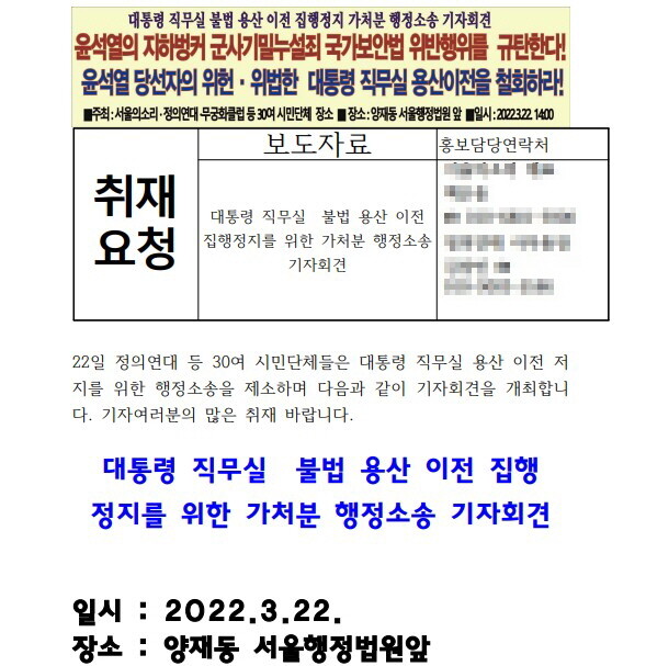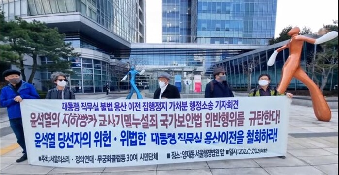 마지막으로 시민단체들은 “대통령 당선자에 불과한 윤석열과 제20대 대통령직 인수위원회가 대통령의 권한을 넘어 관련법을 위반하고 헌법에 규정된 신청인들의 기본권을 침해하는 대통령 직무실 용산이전 결정처분은 취소되어야 한다”며 “행정소송을 통해 실질적 효력이 확정되는 사안에서 긴급하게 각종 법률위반과 국가안보등의 이유로 집행정지를 통하여 우선적 이 처분을 집행을 정지하고자 하는 것이다”고 강조했다