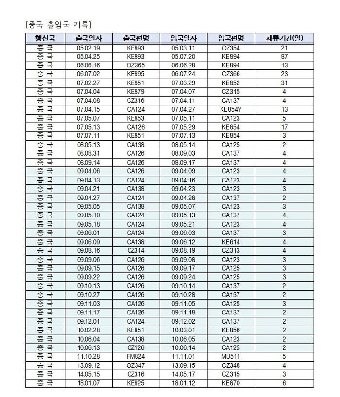 김 후보자는 19일 자신의 페이스북에 2005년 2월 19일부터 2018년 1월 12일까지 중국을 왕래한 출입국 일자, 출국 비행기 편명, 체류 기간이 적힌 문서를 공개했다.