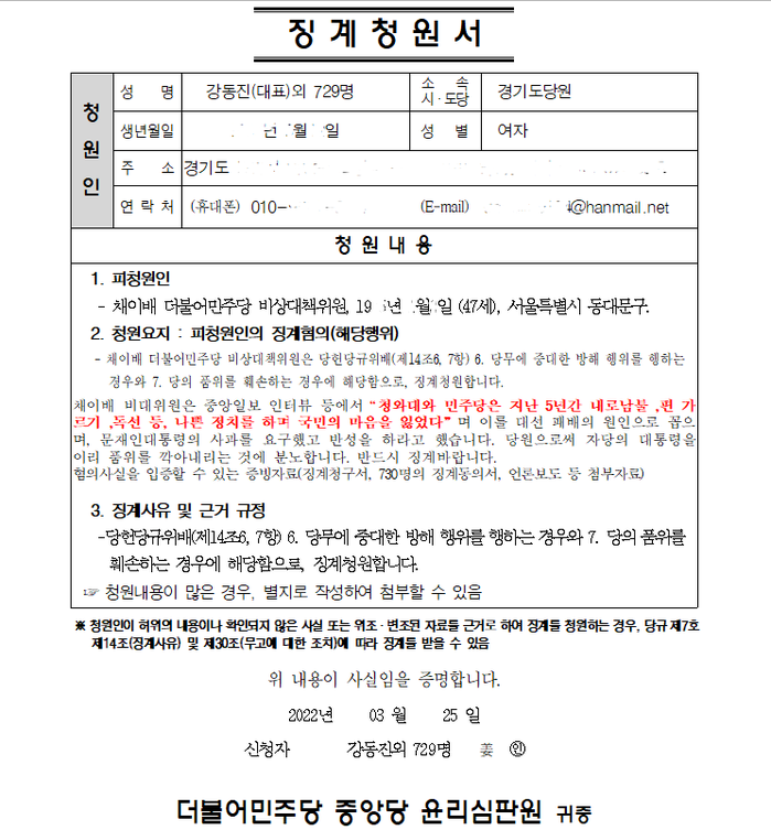 겨우, 작년 21년 12월에 입당한 자가 어찌 "더불어민주당 비상대책위원" 을 하며, 민주당을 욕보이는 짓을 합니까? 라며 728명의 동의서를 첨부하여 제출했다. 이들은 민주당원으로써 언론기사들을 보며, 분노하여 (22년3월18일부터 22년 3월25일) 까지 730명의 동의서를 제출했다.