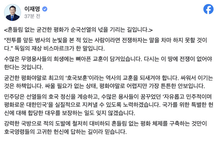 | ▲이재명 대표 페이스북 현충일 메시지 화면 캡쳐 |