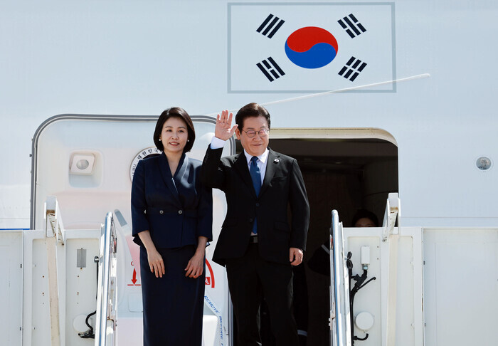 | ▲ 이재명 대통령과 김혜경 여사가 26일(현지시간) 미국 워싱턴DC 인근 앤드루스 합동기지에서 펜실베이니아주 필라델피아로 떠나며 공군 1호기에 올라 인사하고 있다. 2025.8.27 (사진=연합뉴스) |