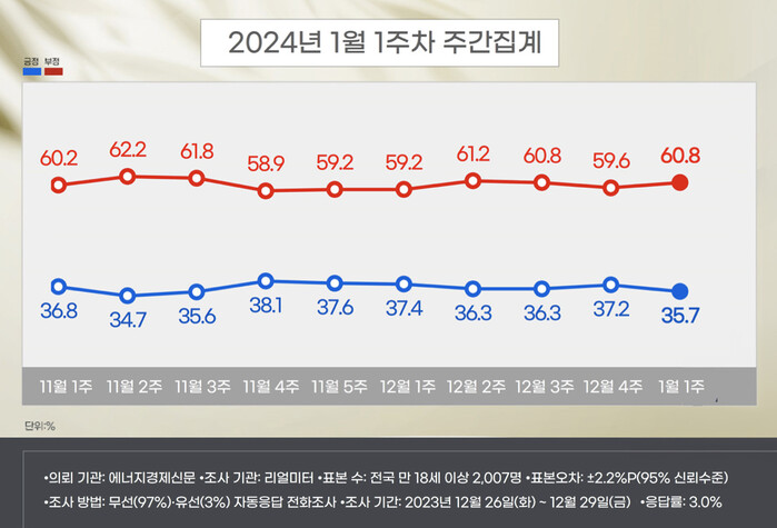 이 여론조사는 리얼미터가 에너지경제신문 의뢰로 지난 2∼5일(1월 1주차) 전국 18세 이상 2천16명을 대상으로 조사한 결과로 표본오차는 95% 신뢰수준에서 ±2.2%p다. 무선(97%)·유선(3%) 자동응답(ARS) 방식으로 진행됐고, 응답률은 3.3%다.