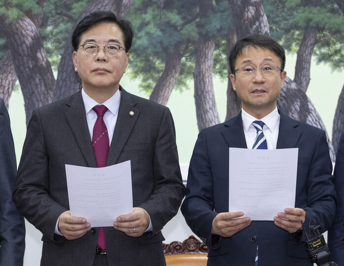 | ▲ 여야, 대미투자특별법 특위 구성 합의 발표. 송언석 국민의힘 원내대표와 한병도 더불어민주당 원내대표 (사진=연합뉴스) |