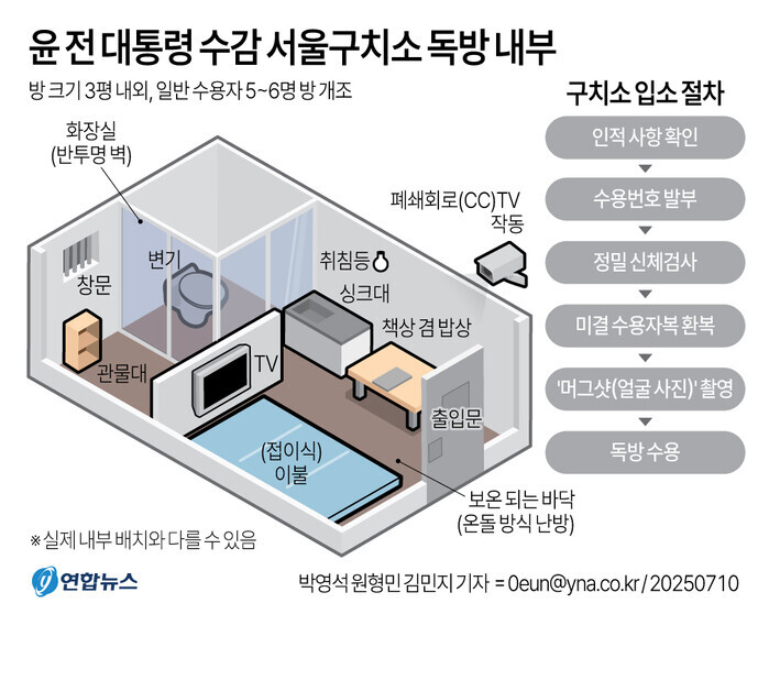 서울구치소 관계자는 언론을 통해 "윤석열이 수감된 후부터 지지자들의 문의 전화가 이어지고 있다"며 곤혹스러움을 표했다. 윤석열은 현재 약 2평대의 독방에 수감된 것으로 알려졌으며, 이는 이명박, 박근혜가 머물렀던 3평대보다 좁은 공간이다. 해당 수용동에는 에어컨 없이 선풍기만으로 냉방을 하는 것으로 전해졌다.