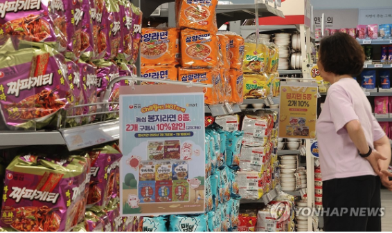 | ▲ 서울 한 대형마트 라면 판매대에 가격 할인 안내문이 붙어 있는 모습 (사진=연합뉴스) |