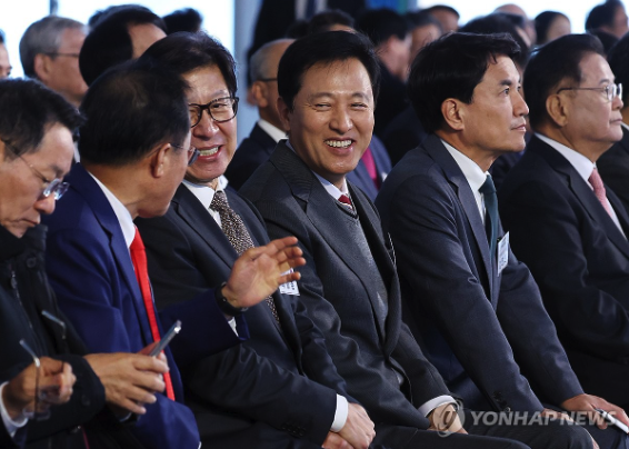 | ▲ 왼쪽부터 유정복 인천광역시장, 홍준표 대구광역시장, 대한민국시도지사협의회장인 박형준 부산광역시장, 오세훈 서울시장, 김진태 강원특별자치도지사, 우동기 지방시대위원장. 2024.11.6 (사진=연합뉴스) |