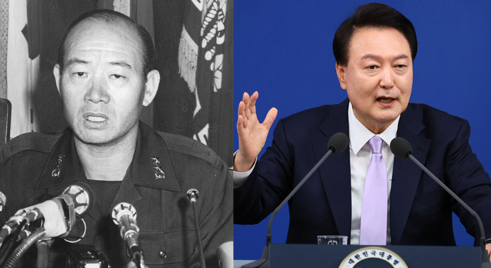 윤석열의 계엄 선포문을 보면 “모든 정치활동의 중지 및 옥내외 집회 시위의 금지, 언론 출판 보도 및 방송의 사전 검열, 각 대학의 휴교령, 직장이탈 및 태업 파업의 금지 등의 조치를 취한... 1980년 5월 17일, 전두환·노태우 등 이른바 신군부 세력들의 비상계엄확대조치를 보는 듯하다.