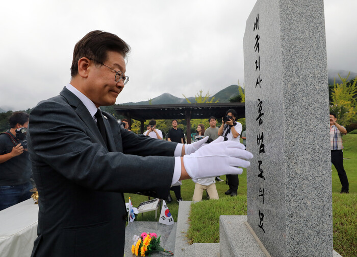 | ▲홍범도 장군 묘역 참배하는 이재명 대표 (사진=연합뉴스) |