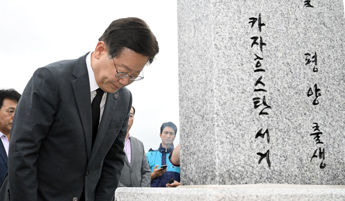 | ▲홍범도 장군 비석 어루만지는 이재명 대표 (사진=연합뉴스) |