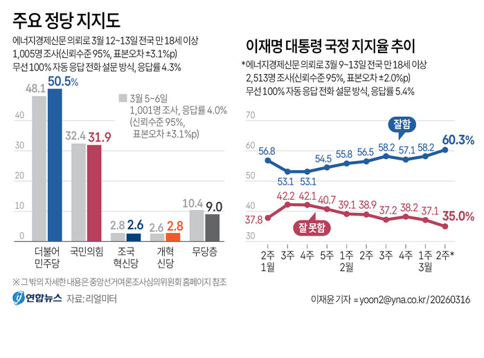 16일 여론조사기관 리얼미터가 에너지경제신문 의뢰로 지난 9일부터 13일까지 전국 성인 2,513명을 대상으로 실시한 조사에 따르면 이재명 대통령의 국정 수행 긍정 평가는 60.3%로 집계됐다. 이는 전주 대비 2.1%포인트 상승한 수치다.