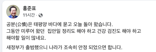 홍 전 시장은 이날 귀국 후 자신의 페이스북에 "공분(公憤)은 태평양 바다에 묻고 오늘 돌아 왔다"며 "그동안 미루어 왔던 집안일 정리도 해야 하고 건강 검진도 해야하고, 해야할 일이 많다"고 남겼다.