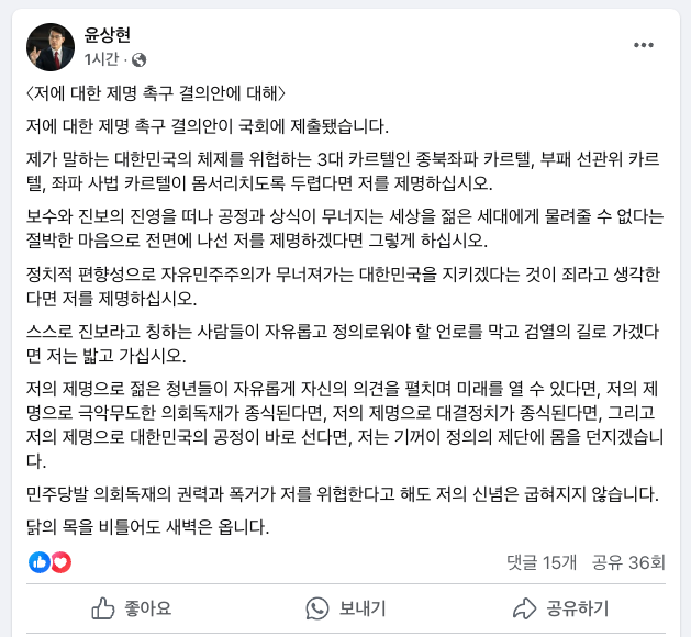 아울러 윤 의원은 "민주당발 의회 독재의 권력과 폭거가 저를 위협한다고 해도 저의 신념은 굽혀지지 않는다"며 "닭의 목을 비틀어도 새벽은 온다"고 덧붙였다.