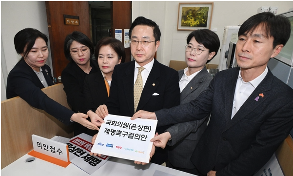 21일 오후 야5당(더불어민주당·조국혁신당·진보당·사회민주당·기본소득당)은 국회 의안과에 윤 의원에 대한 제명 촉구 결의안을 제출했다. 이들은 결의안에 "국회의원으로서의 품위와 명예·권위를 회복하고 대한민국의 불행한 역사를 되풀이하지 않기 위해 윤 의원 제명을 강력히 촉구한다"고 명시했다.