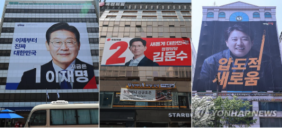| ▲ 이재명-김문수-이준석 후보 대형 현수막 (사진=연합뉴스) |