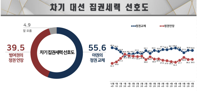 차기 대선 집권세력 선호도 조사에선 ‘정권 교체’ 55.6%, ‘정권 연장’ 39.5%로 집계됐다. ‘정권 교체’ 의견은 직전 조사 대비 0.2%p 하락했고, ‘정권 연장’ 의견은 0.3%p 오른 것으로 나타났다.