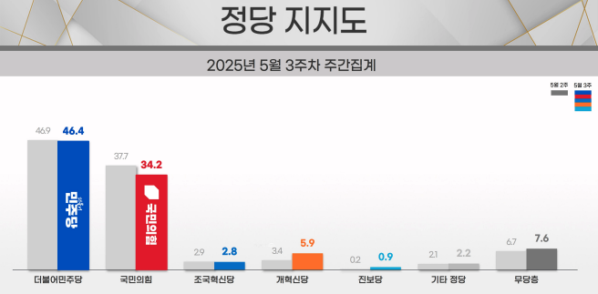 민주당은 전주 대비 소폭 하락(0.5%p)했지만 국민의힘과의 격차는 12%p로 우위를 지켰다. 국민의힘은 단일화 진통으로 당내 분열·갈등이 이어지면서 전주 대비 3.5%p가 하락했다.