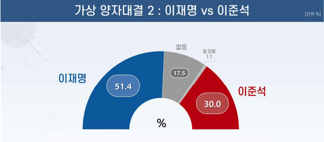 이재명 후보와 이준석 후보의 가상 양자 대결에서는 이재명 후보 51.4%, 이준석 후보 30.0%로 각각 집계됐다.