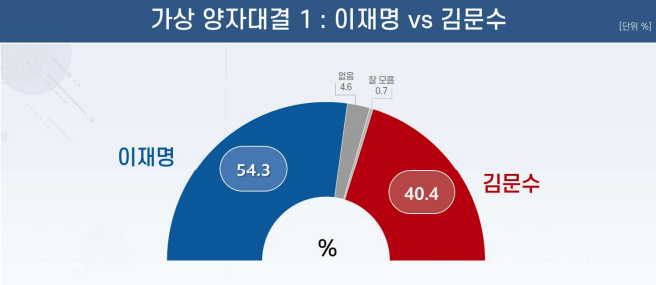 이재명 후보와 김문수 후보의 대선 가상 양자 대결에선 이재명 후보 54.3%, 김문수 후보 40.4%를 각각 기록했다.