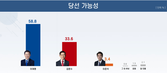 지지 여부와 무관하게 차기 대선 주자 중 누가 당선될 것이라고 생각하는지 ‘당선 가능성’을 물은 조사에선 이재명 후보라고 답한 응답자가 58.8%로 가장 높은 비율을 나타냈다. 김문수 후보 33.6%, 이준석 후보 3.4%로 각각 조사됐다.