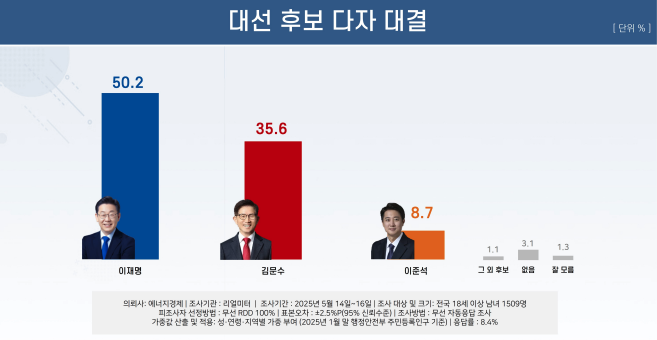 리얼미터가 에너지경제신문 의뢰로 지난 14~16일 전국 18세 이상 유권자 1509명을 대상으로 대선 후보 지지도를 조사한 결과 이재명 후보는 50.2%로 오차범위 밖 1위를 기록했다. (신뢰수준 95%, 표본오차 ±2.5%p)
