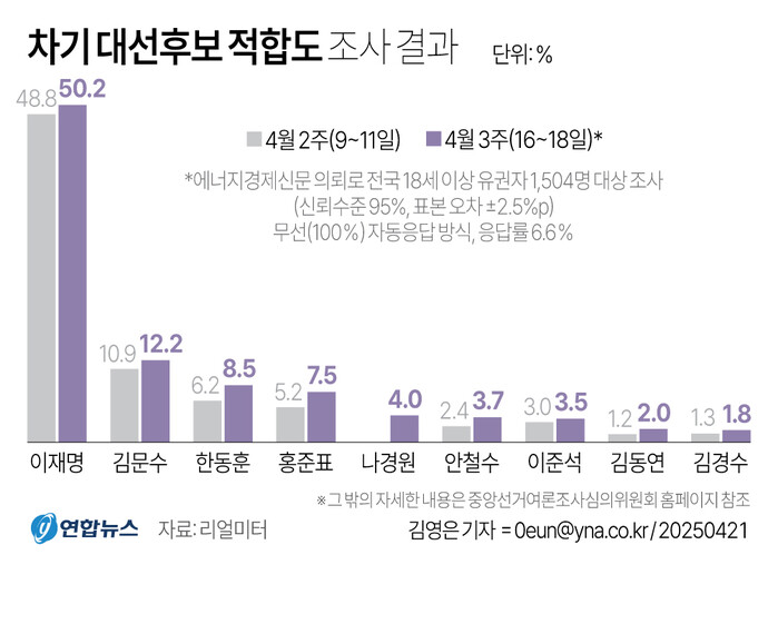 리얼미터가 에너지경제신문 의뢰로 지난 16∼18일 전국 18세 이상 유권자 1천504명을 대상으로 차기 대선주자 적합도를 조사(95% 신뢰수준에 표본오차 ±2.5% 포인트)한 결과, 이 후보는 전주보다 1.4%포인트(p) 오른 50.2%를 기록했다.