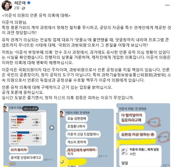 ▲ 16일 허은아 전 개혁신당 대표의 '이준석-CBS김현정 뉴스쇼 유착 의혹' 게시글 (출처=허은아페이스북)
