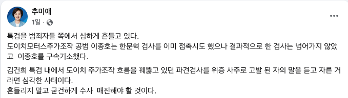 추 위원장은 이날 SNS를 통해 “김건희 특검 내에서 도이치 주가조작 흐름을 꿰뚫고 있던 검사를, 위증 사주 혐의로 고발된 자의 말을 듣고 자른 것이라면 심각한 사태”라며 “해당 검사를 즉시 복귀시켜야 한다”고 밝힌 바 있다.