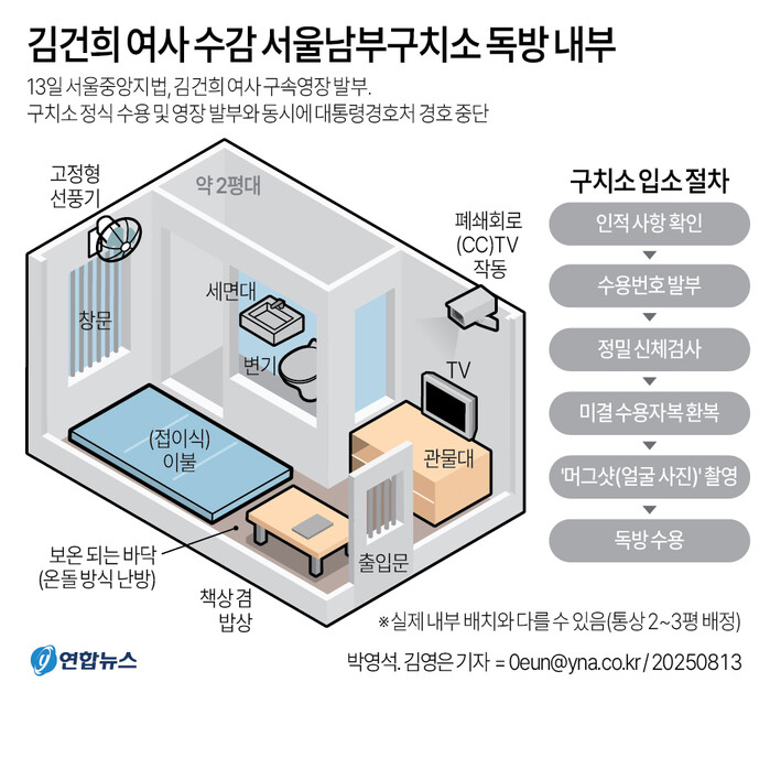 13일 새벽 구속이 결정된 김건희는 서울남부구치소에 정식 수감됐다. 그는 다른 수용자들과 동일한 입소 절차를 밟았다. 인적사항 확인 후 수인번호를 부여받고 신체검사를 마쳤으며, 소지품을 영치한 뒤 카키색 미결수용자복(수의)으로 갈아입고 수용기록부 사진인 '머그샷'을 촬영했다.
