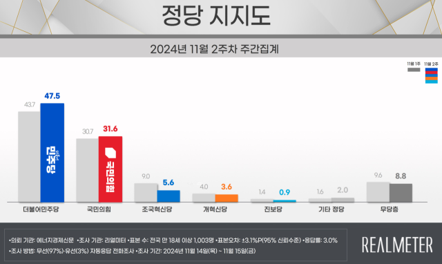 정당 지지율 1위 민주당 47.5%, 3.8%포인트 상승