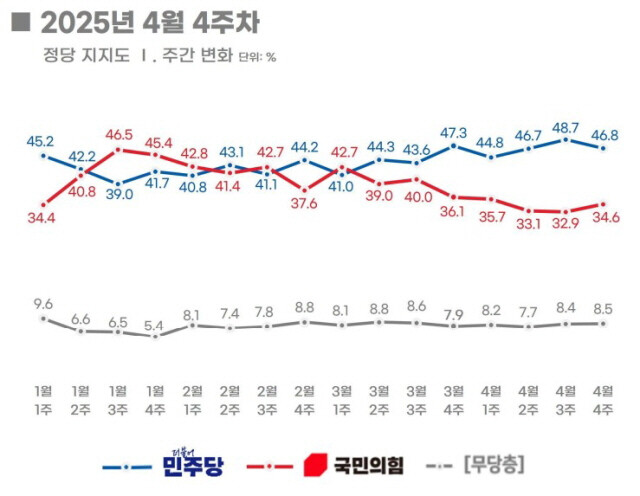정당당지지율…민주당 46.8% vs 국민의힘 34.6%