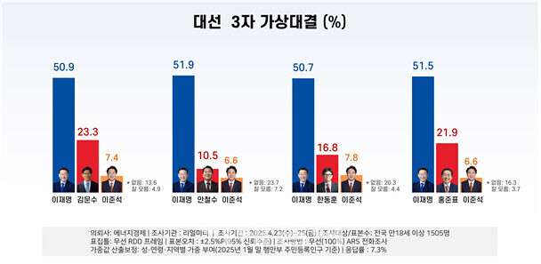 리얼미터가 에너지경제신문 의뢰로 지난 23∼25일 전국 만 18세 이상 유권자 1천505명을 대상으로 한 대선 후보 3자 가상 대결에서 이 후보가 50%를 넘는 득표를 받고 있는 것으로 집계됐다.