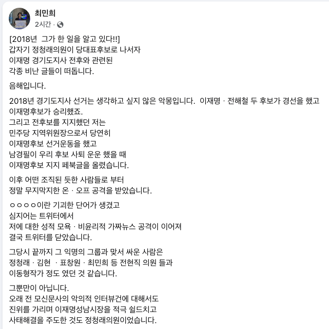 최민희 더불어민주당 의원은 당대표 선거 출마를 선언한 정청래 의원을 향해 일부 유튜버들과 강성 친명 지지자들이 '이재명 대통령을 비난한 전력이 있다'며 비난하자 "정 의원 충정을 잘못 알고 있다"며 두둔했다.