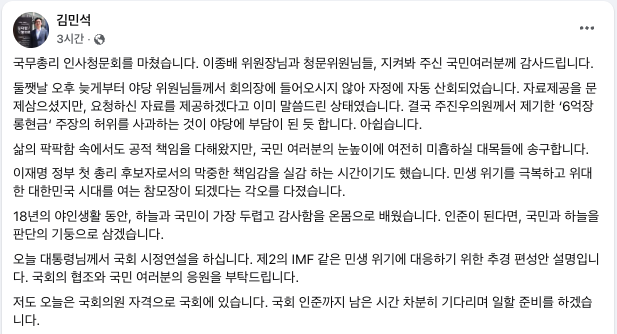 | ▲ 2025.6.26 김민석 국무총리 후보자의 게시글 (출처=김민석 페이스북) |