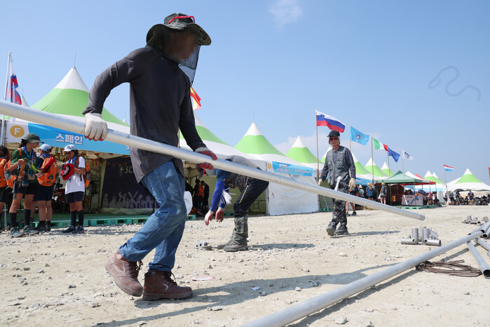 윤석열 대통령은 태풍 '카눈'의 한반도 북상에 따라 '2023 새만금 잼버리'가 조기퇴영한 후 문제없이 남은 일정을 소화할 수 있게 정부 비상대책반을 가동하라고 지시했다. 하지만 현실은 그렇지 못한 모습이다.