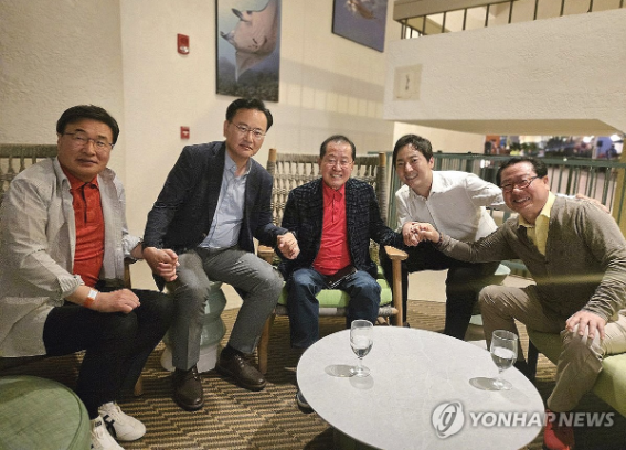 | ▲ 2025.5.21 홍준표 전 대구시장의 선대위 합류를 설득하기 위해 하와이 방문한 유상범 단일화추진본부장, 김대식 대외협력본부장, 조광한 대외협력부본부장, 이성배 선대위 대변인과 홍 전 시장 (사진=연합뉴스) |