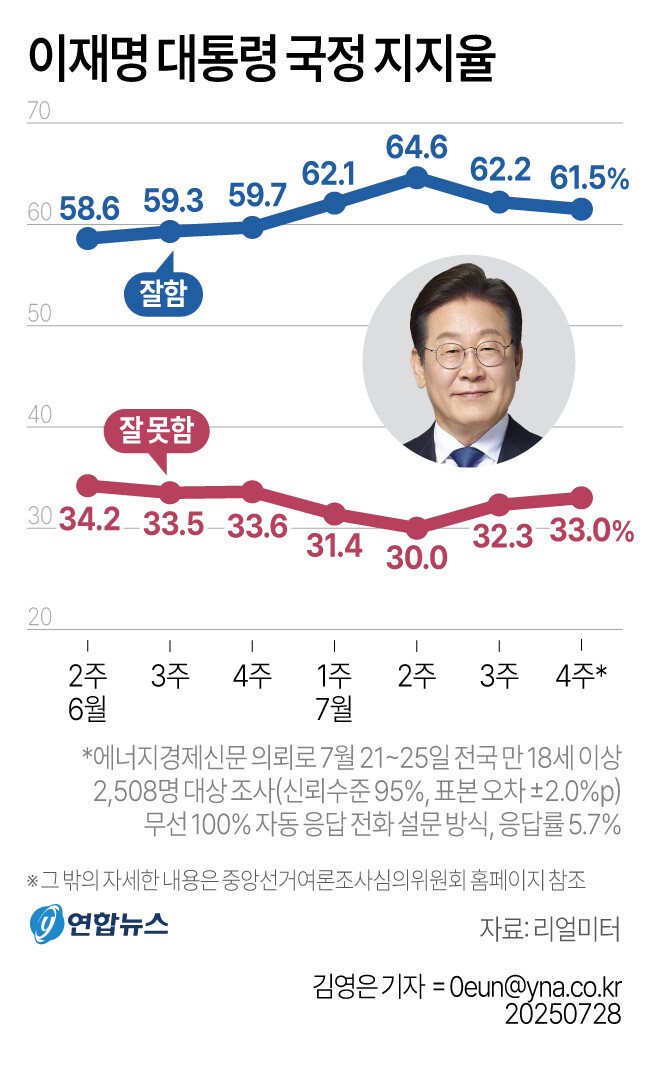 여론조사 전문기관 리얼미터가 에너지경제신문 의뢰로 지난 21일부터 25일까지 실시해 28일 발표한 여론조사 결과에 따르면, 이 대통령의 국정수행에 대한 긍정평가는 61.5%로 집계됐다. 이는 전주 대비 0.7%p 하락한 수치로, 2주 연속 하락세다. 부정평가는 33.0%였다.
