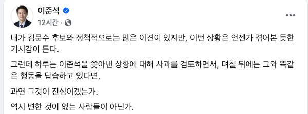 이 후보는 이날 밤 페이스북에 “내가 김문수 후보와 정책적으로는 많은 이견이 있지만, 이번 상황은 언젠가 겪어본 듯한 기시감이 든다”고 썼다. 이어 “하루는 이준석을 쫓아낸 상황에 대해 사과를 검토하면서, 며칠 뒤에는 그와 똑같은 행동을 답습하고 있다면, 과연 그것이 진심이겠는가”라며 “역시 변한 것이 없는 사람들이 아닌가”라고 했다.