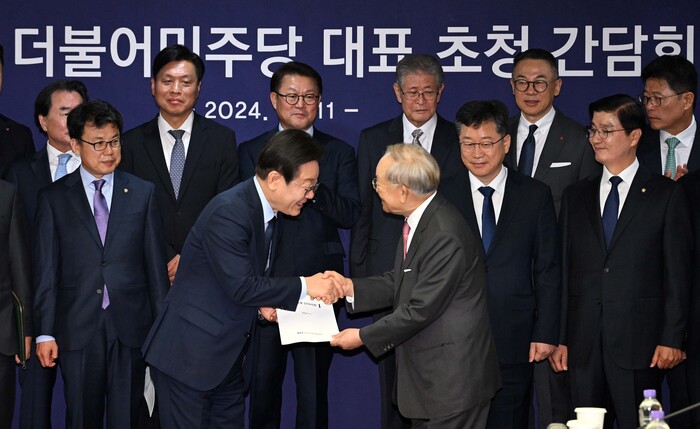 | ▲ 11일, 이재명 대표에게 경영계 건의사항 전달하는 한국경영자총협회 손경식 회장 (사진=연합뉴스) |