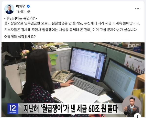 이재명 더불어민주당 대표가 지난해 정부가 거둬들인 근로소득세가 60조원을 돌파했다는 사실을 전하며 "월급쟁이는 봉인가?"라고 지적했다.