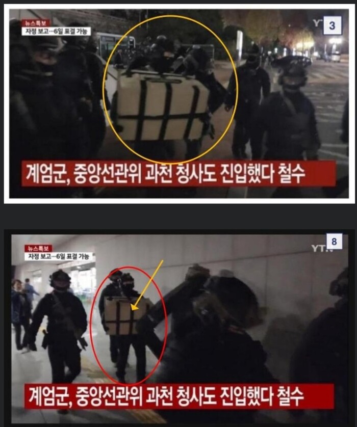 그러나 선관위의 ‘반출 물품이 없었다’는 설명과는 달리 당시 계엄군이 선관위에서 나오는 영상에는 계엄군이 어른 몸집만한 박스를 들고 나오는 장면이 포착됐다. 해당 박스는 검은색 테이프로 두세차례 감긴 상태에서 운반됐다.