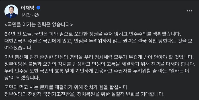 이 대표는 19일 페이스북에 "64년 전 오늘, 국민은 피와 땀으로 오만한 정권을 주저 앉히고 민주주의를 쟁취했다"며 "대한민국의 주권은 국민에게 있고 민심을 두려워하지 않는 권력은 결국 심판당한다는 것을 보여주셨다"고 적었다.