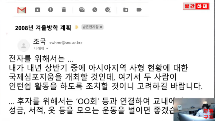 | ▲조국 전 장관, 학생들과 인권문제에 대해서 인턴쉽활동을 제시. 출처; 빨간아재 유튜브캡쳐 |