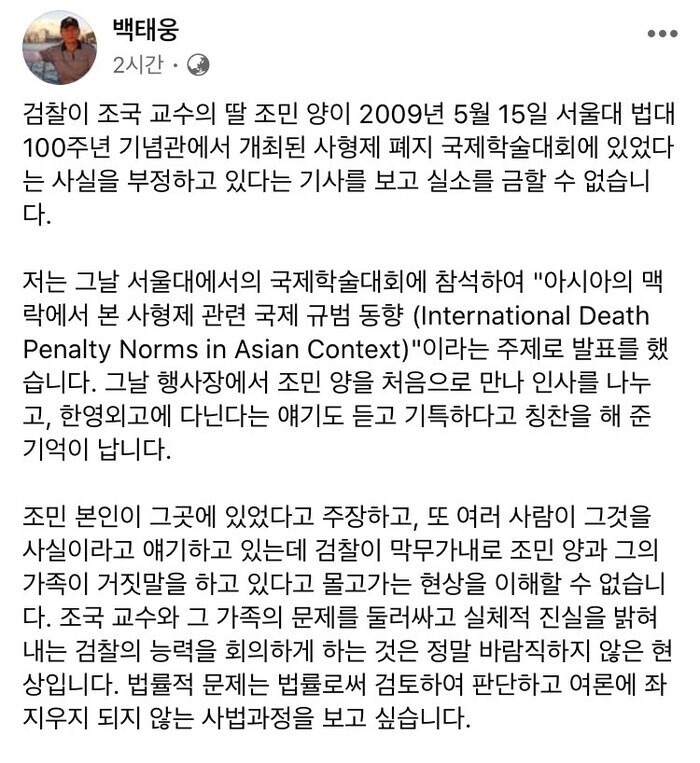 같이 발제자로 나섰던 백태웅 교수님은 페이스북에 이렇게 올렸다. 서울대 백주년기념관에서의 법학컨퍼런스 날, 조국교수와 조민양을 만났었고, 직접 얘기도 나누었고, 고등학생이 대학에 와서 자원봉사 하는것이 기특하여, 칭찬까지 했었고, 그 내용에 대한 진술을 법원에 서면으로 제출까지 했는데, 조민양이 서울대 행사장에 없었다고 1심 재판부가 판결을 했다니 이게 말이 됩니까? 라고 올렸다.